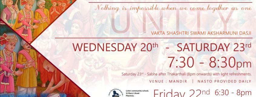 The katha will be recited by Aksharmuni Swami in both English and Gujarati from Wed 20 Sept – Sat 23 Sep from 7:30-8:30 followed by snacks thereafter!
