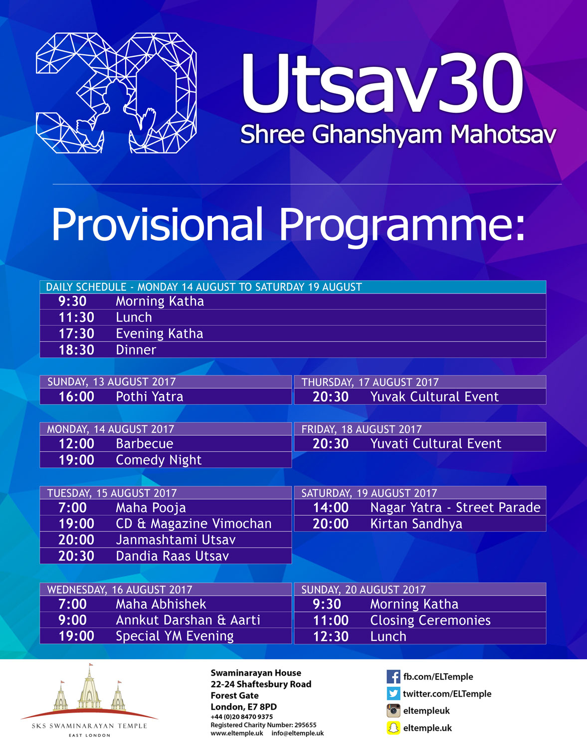 To keep up to date with all the goings on, download the Utsav30 app at https://eltemple.uk/app, available for both iOS and Android.